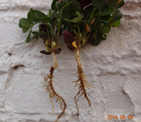 癥狀:花生根結(jié)線蟲(chóng)病主要為害植株的地下部,因地下部受害引起地上部生長(zhǎng)發(fā)育不良。幼苗被害,一般出土半個(gè)月后即可表現(xiàn)癥狀,植株萎縮不長(zhǎng),下部葉變黃,始花期后,整株莖葉逐漸變黃,葉片小,底葉葉緣焦灼,提早脫落,開(kāi)花遲,病株矮小,似缺肥水狀,田間常成片成窩發(fā)生。雨水多時(shí),病情可減輕。
