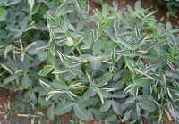 癥狀:病菌從子葉或幼根侵入植株,在根頸部產(chǎn)生黃褐色水漬狀病斑,后變黑褐色,引起根基組織腐爛。當(dāng)潮濕環(huán)境時(shí),病部產(chǎn)生分生孢子器(即黑色小突起),病部表皮易剝落,纖維組織外露。當(dāng)環(huán)境干燥時(shí),病部表皮凹陷,緊貼莖上,成株期感病后,約10~30天全株枯死,發(fā)病部位多在莖基部貼地面,有時(shí)也出現(xiàn)主莖和側(cè)枝分期枯死現(xiàn)象。