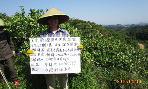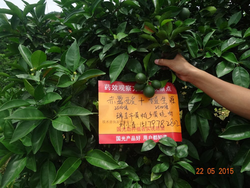 2015年4月,江西省贛州市石城縣沙段村,在臍橙謝花2/3和第二次生理落果期使用兩次“國(guó)光植生源2000-2500倍+赤霉酸2000-2500倍+氨基酸水溶肥1000倍”葉面噴施,使用后的臍橙葉片深綠,光澤度好,坐果率高,果型均勻,保果效果明顯。