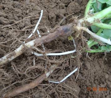 試驗背景:隨著馬鈴薯面積的擴大,連作障礙土傳性病害越來越嚴重,特別是像黑痣病、枯萎病近2年發(fā)生特別嚴重,而且治療非常困難。市面上防治這類病害的藥劑效果好的很少。2014年由于前期地溫比較低、濕度大,黑痣病感染比較嚴重,有的甚至已經(jīng)感染匍匐莖,嚴重影響到馬鈴薯的生長。