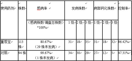 (3)對照地塊本身發(fā)病較輕,感病率只有42.4%,且大多數(shù)是1級、2級,調(diào)查時發(fā)現(xiàn)未鈣化植株比例較大,且多數(shù)為發(fā)病3級的植株。其自然控制率只有85.71%。