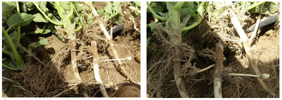 此馬鈴薯地塊由于受黑痣病的影響出苗不齊,苗長勢較差,特別是幼苗感染黑痣病較多,嚴重的地方出現(xiàn)莖基部腐爛、斷裂。
