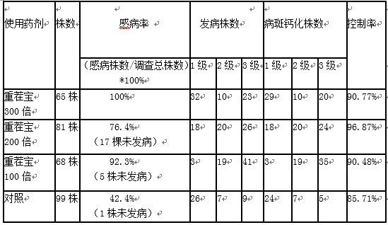 2、 用藥處理后,大多數(shù)植株病斑已鈣化,病情發(fā)展得到控制,其中重茬寶200ml/畝控制率達到96.42%,其中對發(fā)病較輕的植株(1級、2級)控制率達到100%。