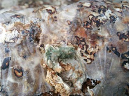 春季溫度回升,菌棒上殘留的菇根等雜物易感染霉菌,發(fā)生霉變。因此,采菇后,要及時清除菌棒上殘留的菇根等雜物,防止雜菌感染。春季危害香菇常見的害蟲主要有菇蚊、菇蠅等,可在出菇間隔期使用氯氰菊酯等低毒農(nóng)藥進行防治。
