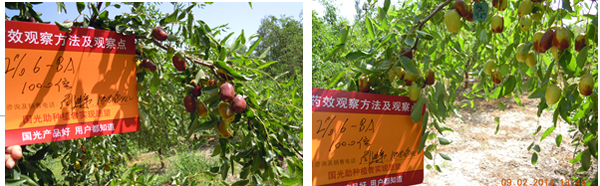 2014年7月,新疆吐魯番伊拉湖鮑秀,在灰棗幼果期噴施國(guó)光植生源1000倍+國(guó)光優(yōu)豐1500倍,使用1次,成熟期觀察,使用保果膨果套餐灰棗,保果效果好,棗果膨大明顯,且不影響上色成熟,畸形果率少;對(duì)產(chǎn)量進(jìn)行測(cè)定,使用保果套餐灰棗增產(chǎn)12%。
