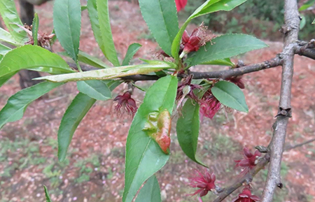 桃樹縮葉病主要為害葉片,嚴(yán)重時也可以為害新梢和幼果。