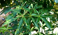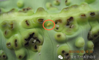 圖4.用藥前 圖5、用藥后(有效防治的表現(xiàn):老葉的“包狀物”不會(huì)消失,但其不再變大,且不穿孔;新葉在生長(zhǎng)至老葉的過(guò)程中幾乎不再形成“包狀物”,恢復(fù)正常生長(zhǎng))